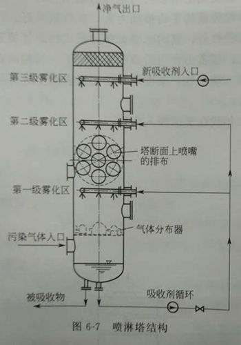 (3)噴灑式吸收器用噴嘴將液體噴射成為許多細(xì)小的液滴,以增大氣液接觸面,完成傳質(zhì)過(guò)程。比較典型的設(shè)備是空心噴酒吸收器(噴淋塔或稱空塔)和文丘里吸收器噴淋塔是塔器中出現(xiàn)最早的氣液傳質(zhì)設(shè)備之結(jié)構(gòu)簡(jiǎn)單,塔內(nèi)只設(shè)若干噴嘴,氣體由下部進(jìn)入,液體由上部噴入,塔的上部設(shè)有除霧器目前在有害氣體治理中,對(duì)空塔的應(yīng)用研究非?;钴S,出現(xiàn)了許多新的結(jié)構(gòu)形式。噴淋塔結(jié)構(gòu)如圖6-7所示。